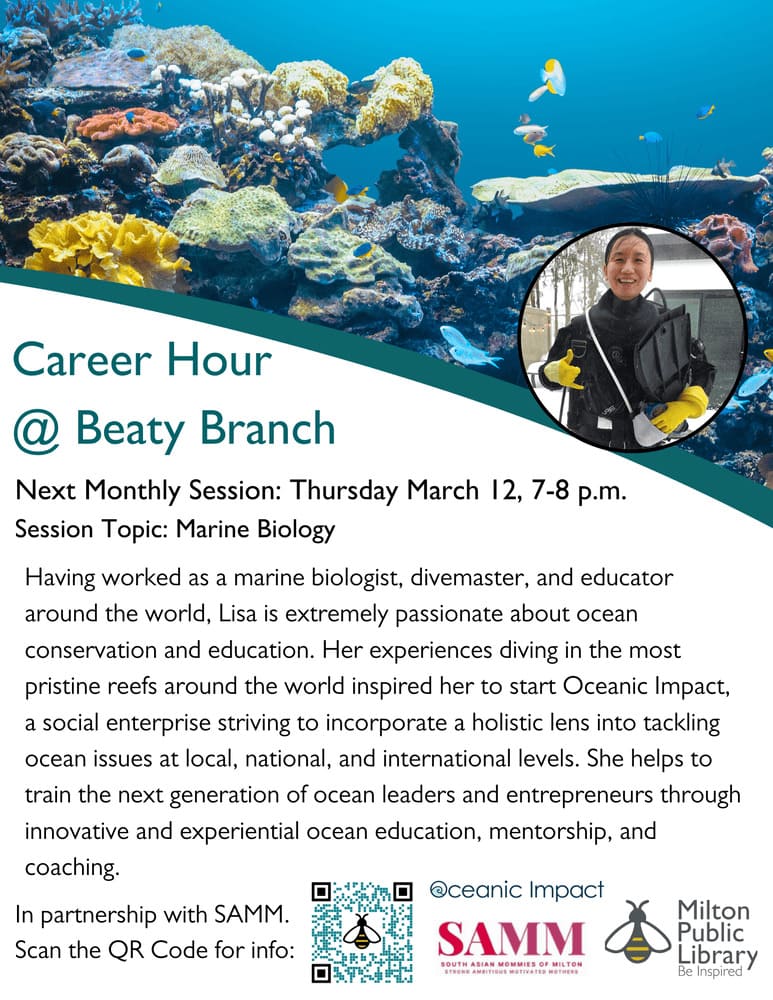 This event is hosted by the Milton Public Library. We are invited to speak on March 12, 2026, on career in Marine Biology