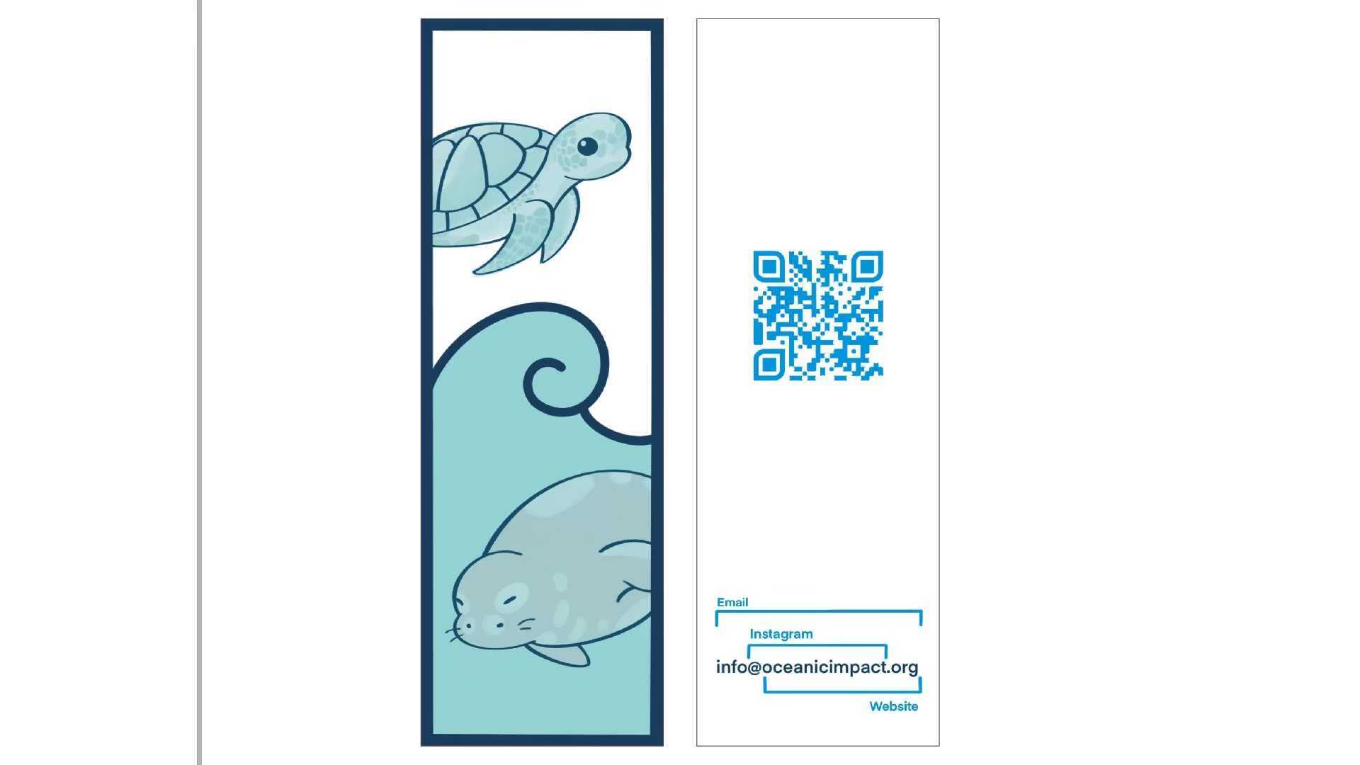 Bookmark featuring cute marine animals drawn by Oceanic Impact volunteer. Oceanic Impact’s contact information is featured on the back.